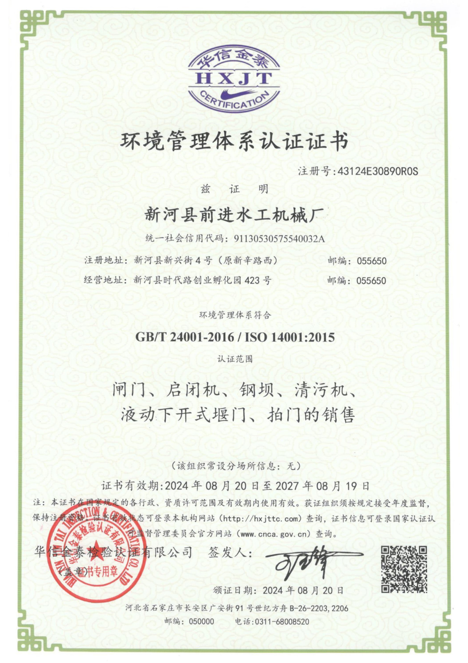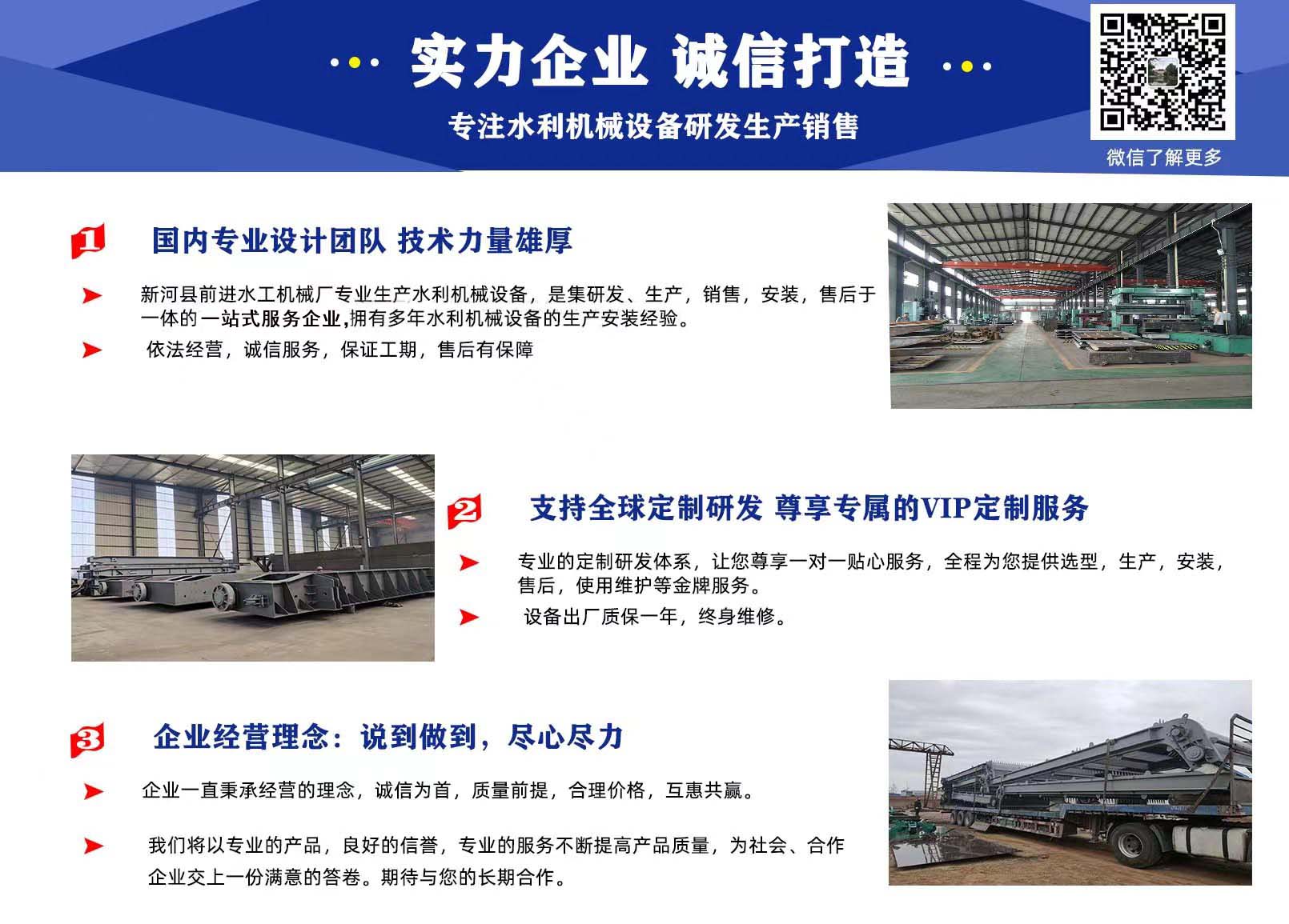 新河縣前進(jìn)水工機(jī)械廠是一家專門(mén)從事水利工程設(shè)備研發(fā)生產(chǎn)的廠家,現(xiàn)有員工228人,各類高、中級(jí)專業(yè)工程技術(shù)人員近30人,技術(shù)生產(chǎn)工人180多人。公司占地面積14674平方米。公司擁有車、鉗、刨、銑、冷作、鈑金、鑄造等,工種齊全,加工能力和技術(shù)力量雄厚,并具備理化測(cè)試手段與儀器設(shè)備。前進(jìn)水工專注景觀閘門(mén),鋼壩,合頁(yè)壩,液壓升降壩,液壓閘門(mén),臥倒門(mén),一字門(mén),人字門(mén),液壓?jiǎn)㈤]機(jī),卷?yè)P(yáng)啟閉機(jī),螺桿啟閉機(jī),清污機(jī),除污機(jī),閘門(mén),拍門(mén)等設(shè)備的研發(fā)與生產(chǎn),是新河水利工程產(chǎn)品行業(yè)的領(lǐng)跑者,不僅在同行業(yè)群中揭起了一次又一次的技術(shù)革新,更為水利工程企業(yè)提供了更高更大的選擇平臺(tái)。